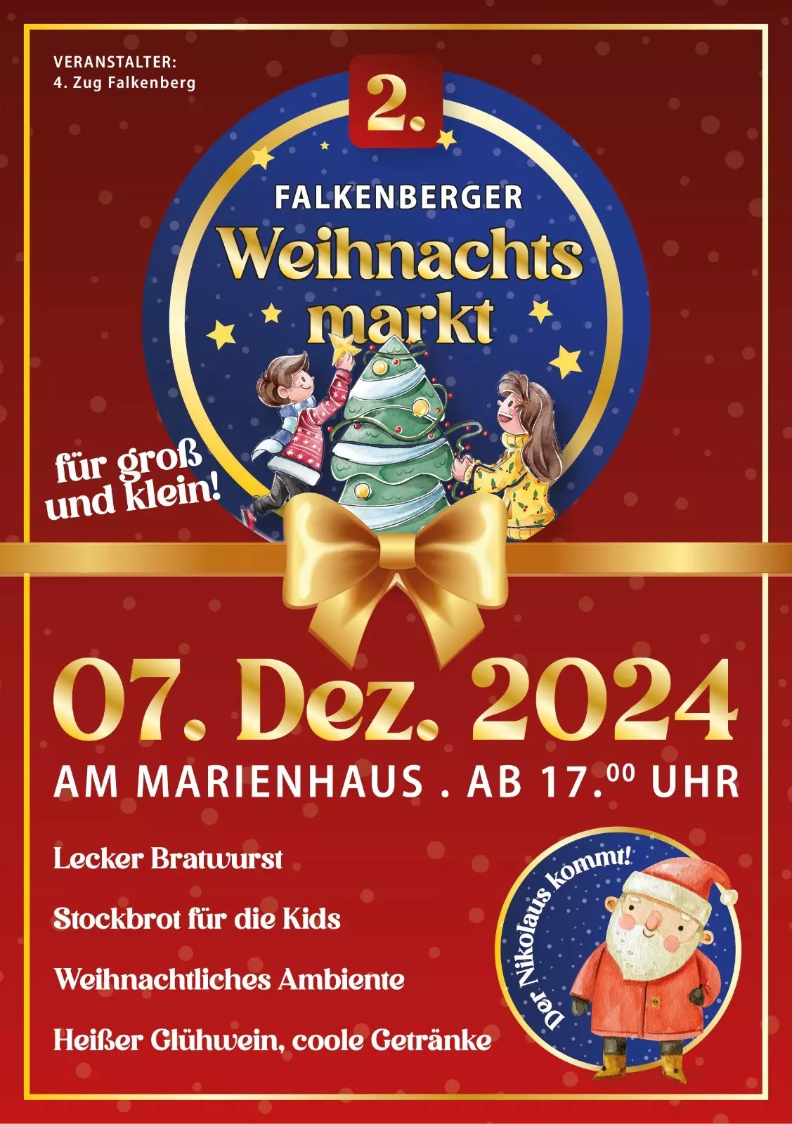 Falkenberger Weihnachtsmarkt beim Marienhaus für groß und klein. Veranstaltet vom 4. Zug Falkenberg Mit: Bratwurst, Stockbrot für die Kinder, heißem Glühwein und kalten Getränken in weihnachtlichem Ambiente.